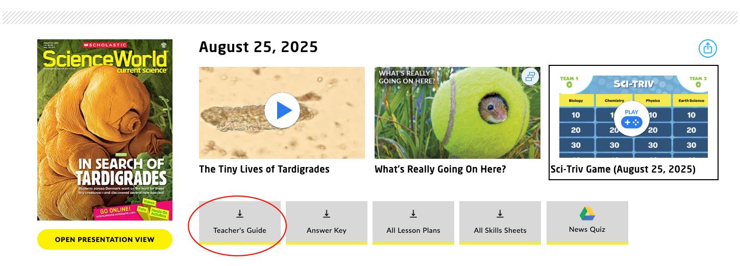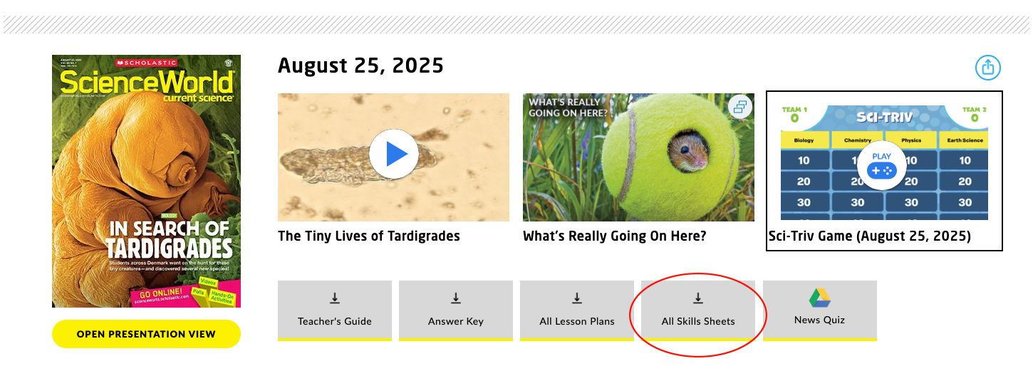 Your Science World subscription comes with hundreds of teaching resources, including skill-building activity sheets. These skills sheets build and assess reading comprehension, develop writing fluency, and reinforce science and engineering practices, such as analyzing data, using models, and arguing from evidence. You can see a full list of skills sheets offered with each issue in the Teacher's Guide, which you can access from the menu to the right of the issue cover. (The Answer Key is located to the right of the issue cover as well.)